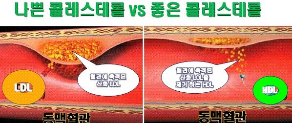 그런데 문제는 LDL이 과도하게 되면 혈관 벽에 쌓이는 거예요. 그러면 혈관벽이 두꺼워지고 혈관이 좁아집니다. 혈관 벽이 좁아지면서 고혈압이 발생하고 심하면 죽상경화가 되고 피떡이 혈관을 막아 동맥경화가 될 수도 있습니다. HDL콜레스테롤